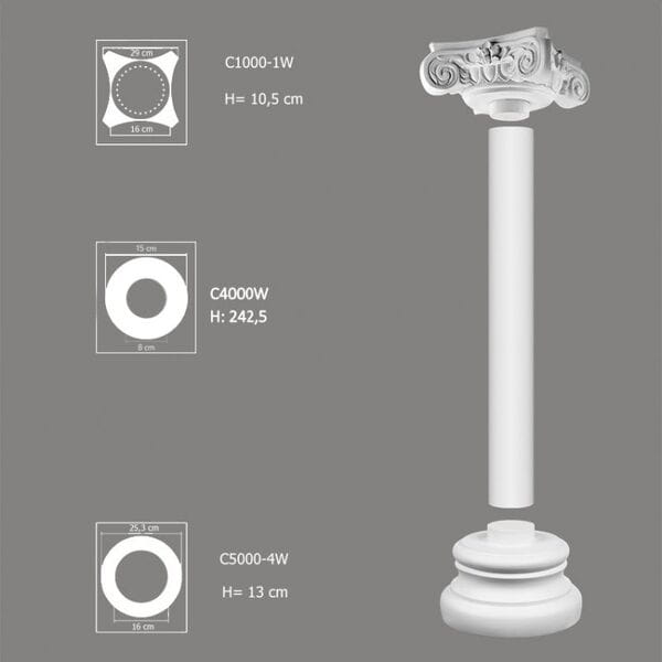 Kolumna C4000W przeznaczona jest do montażu z odpowiednią podstawą i nasadą, z którymi tworzy elegancki i spójny zestaw dekoracyjny. Jej montaż jest szybki i prosty — wystarczy skleić poszczególne elementy. Kolumnę można również pomalować farbami wodnymi, niezawierającymi rozpuszczalników, co pozwala idealnie dopasować jej wygląd do stylu całego wnętrza.